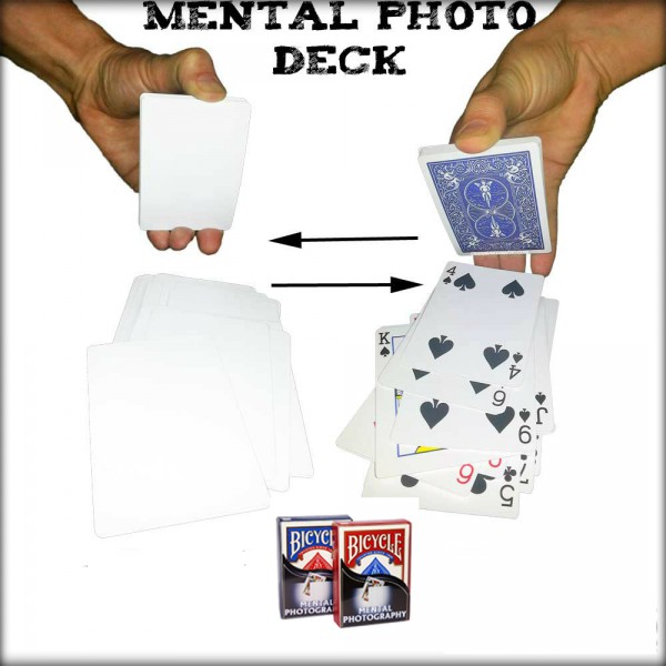 Le magicien présente un jeu de cartes blanches des deux côtés et explique qu’il peut imprimer par la pensée les cartes qu’il désire.
