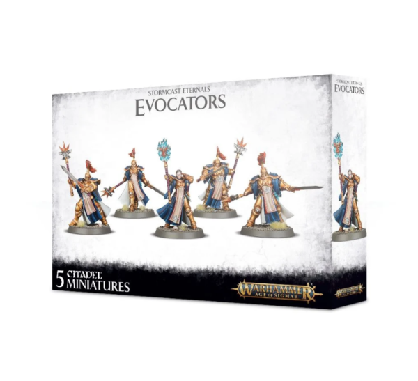 Ce kit plastique contient les composants nécessaires pour assembler 5 Stormcast Eternals Evocators. Chacun des 5 porte l’armure des Stormcast Eternals, plus des tabards, capes et heaumes ouvragés qui indiquent leur fonction de troupes de choc de Sigmar nanties de la puissance de la foudre. On reconnaît notamment chez eux le symbole de la Chambre Sacro-sainte, l’enclume à triple pointe. Chacun peut être armé d’une lame tempête et d’un sceptre d’orage, ou d’un grand sceptre à deux mains. Des options sont fournies pour réaliser un Evocator-Prime – avec variante masculine ou féminine, et dans une pose au choix: soit en train de jeter un éclair magique, soit main sur la tête en train de se concentrer sur une incantation particulièrement puissante. On peut assembler une des figurines en tant que Knight-Incantor à la barbe bien fournie, cheveux aux vents, qui adopte une pose dissuasive à l’adresse de l’ennemi.